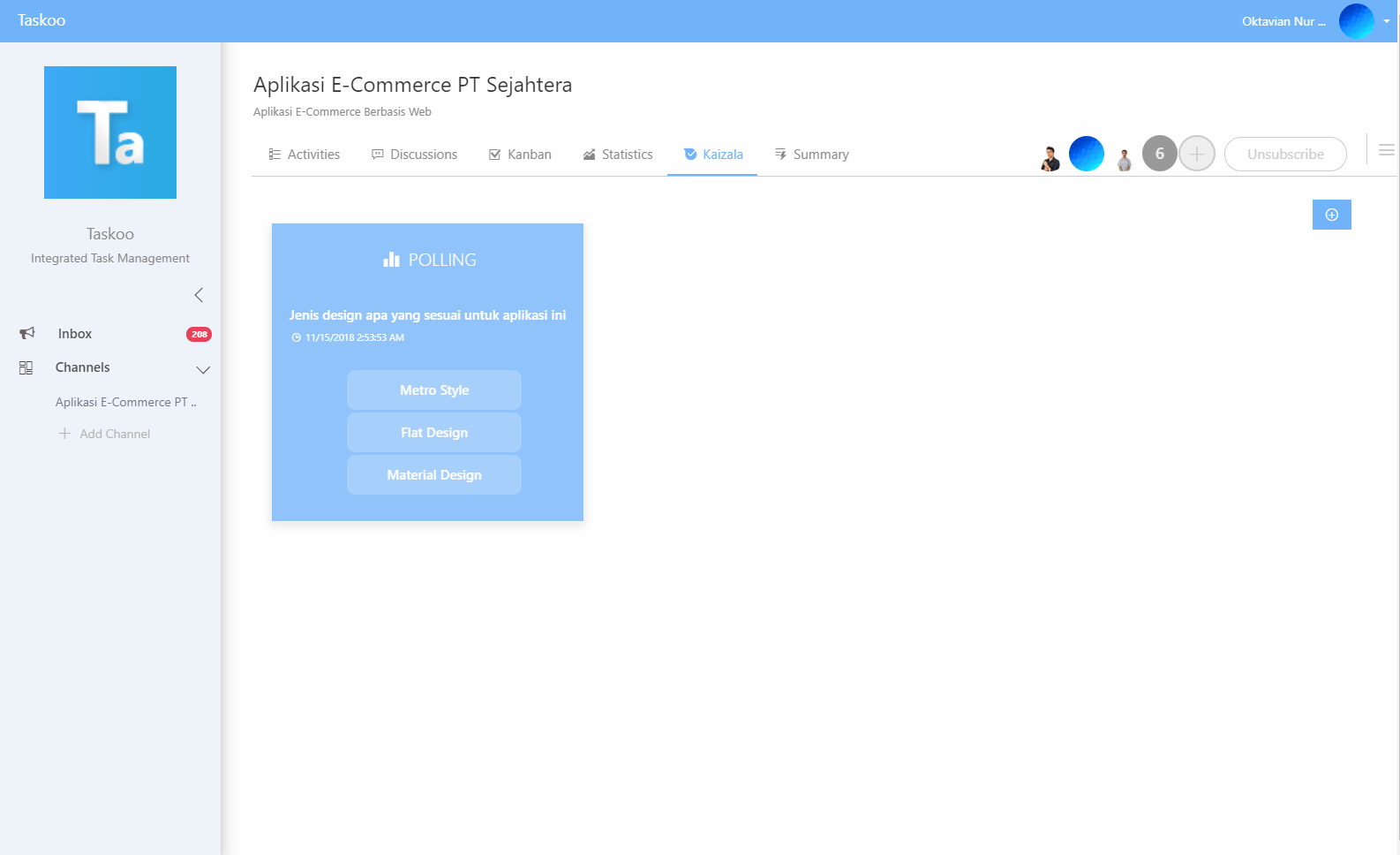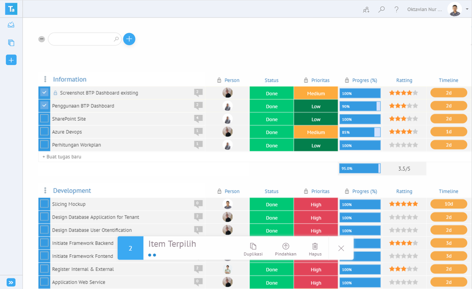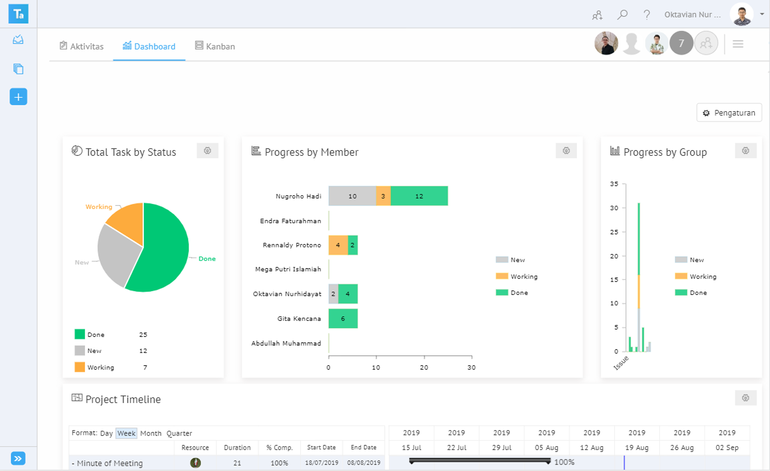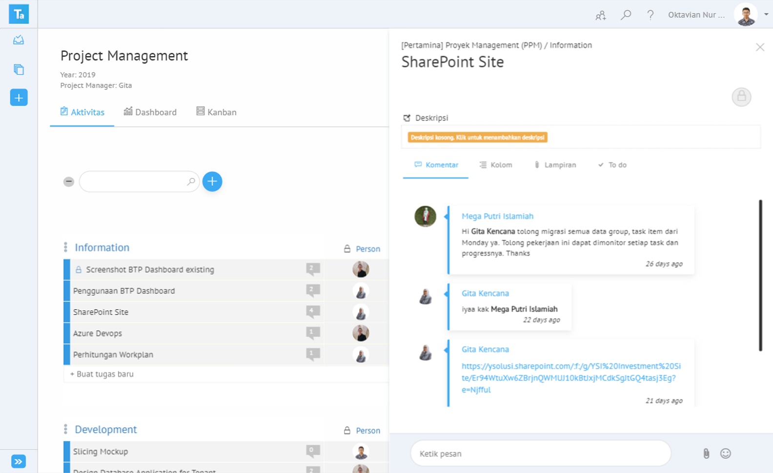 Sebuah platform aplikasi terintegrasi yang bertujuan untuk mengelola aktivitas pekerjaan. Platform aplikasi ini memungkinkan pengguna untuk saling berkolaborasi dalam beberapa pekerjaan yang berbeda. Komunikasi dapat dilakukan melalui diskusi forum dan pelaporan pekerjaan yang sedang berlangsung.